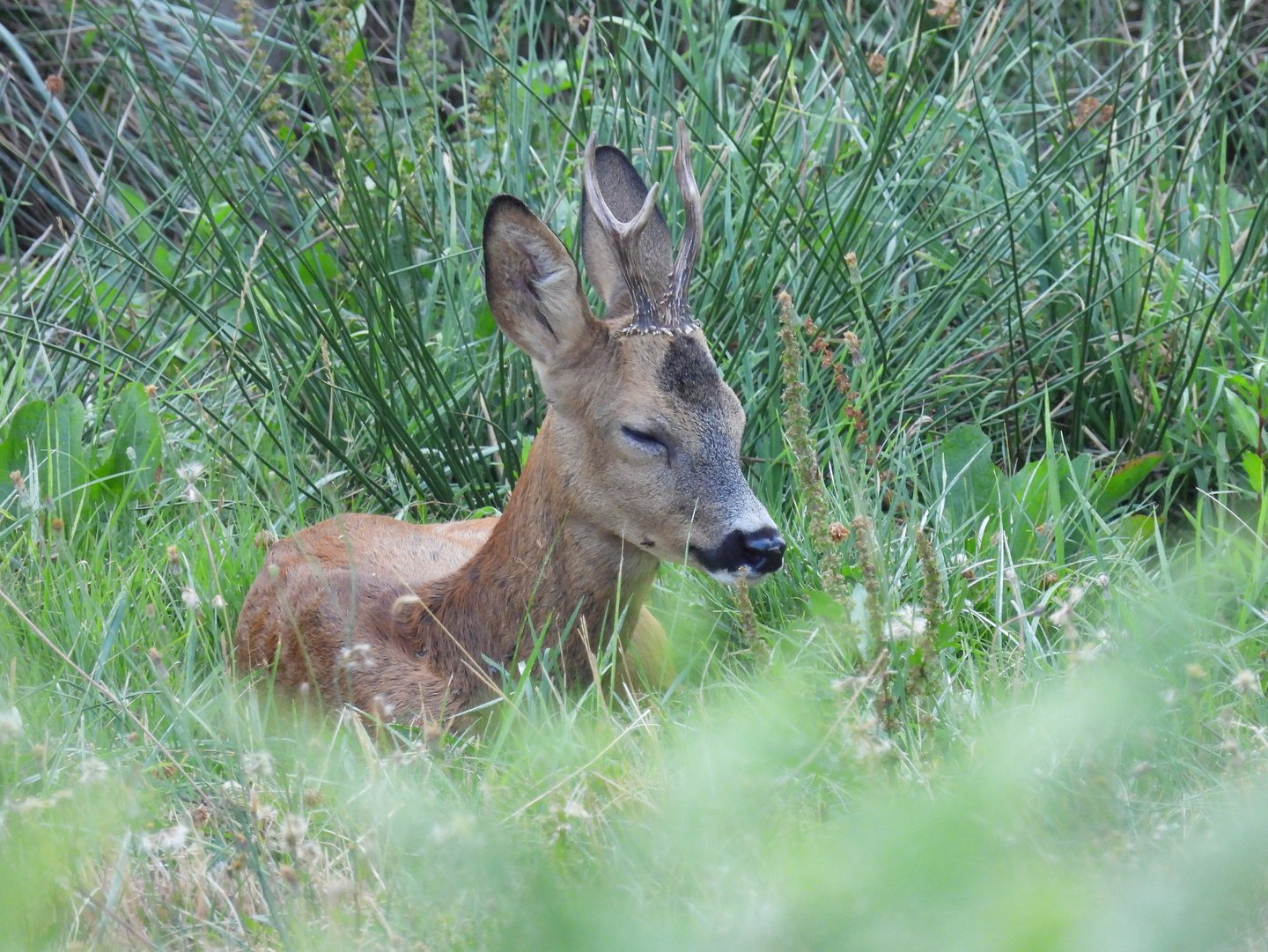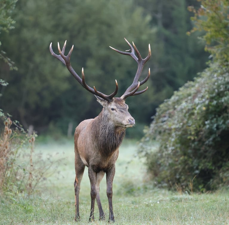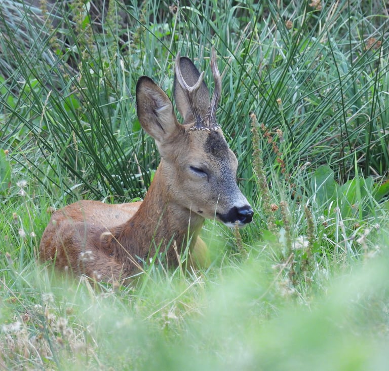 Ma vie de Chevrette : ce matin à l'orée du jour, quand la forêt s'éveille, je m'aventure en silence dans les hautes herbes perlées de rosée...un moment de tranquilité propice au nourrissage.