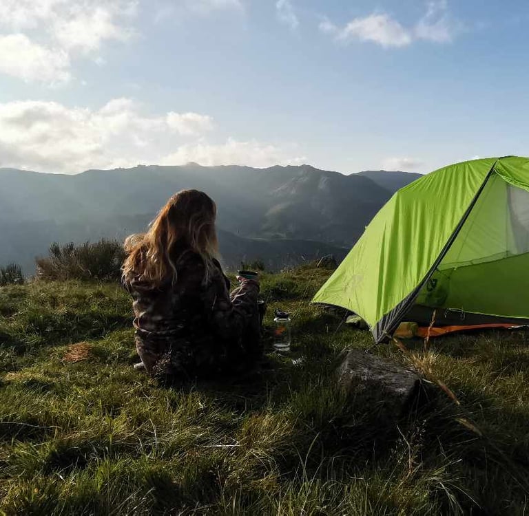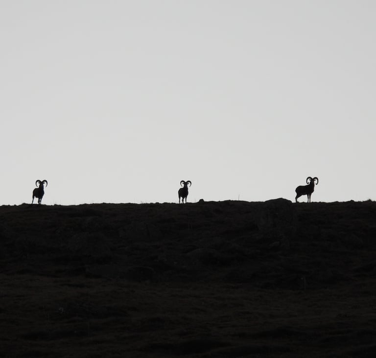 Magie d'un matin paisible, où le doux chant des alouettes me réveille dans un décor splendide... 3 mouflons se montrent en crête juste au dessus de ma tente, un instant suspendu, où la nature se dévoile dans toute sa beauté.