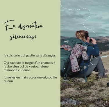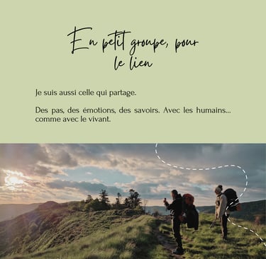 Amoureuse de la nature, hypersensible et guidée par l’éthique, je marche au rythme du vivant. J’invite chacun à ralentir, à observer, à écouter, à ressentir… et à se reconnecter à ce qui fait battre le cœur de la Terre.