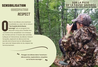 À travers des ateliers scolaires et sorties pédagogiques en environnement, je les accompagne à la découverte de la faune et de la flore, en éveillant leur curiosité et leur respect du vivant.